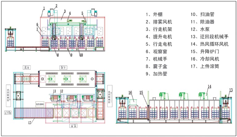 上件滾筒段、 清洗段、迂回轉(zhuǎn)角段、烘干爐段、風(fēng)冷段、吊籃及電器控制系統(tǒng)組成。